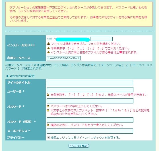 見てもらえばわかる通り、かなり単純な作りになっています。この画面を入力するだけでWordPressは簡単にインストールが可能です。