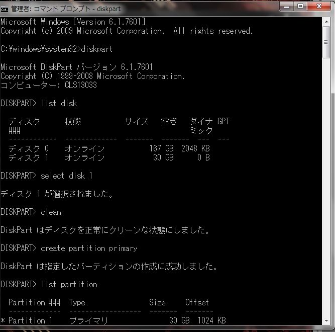 select partition 1 今作ったパーテーションの中からパーテーションの1番目を選択するコマンド、3つあったらその中から選ぶときもあります。