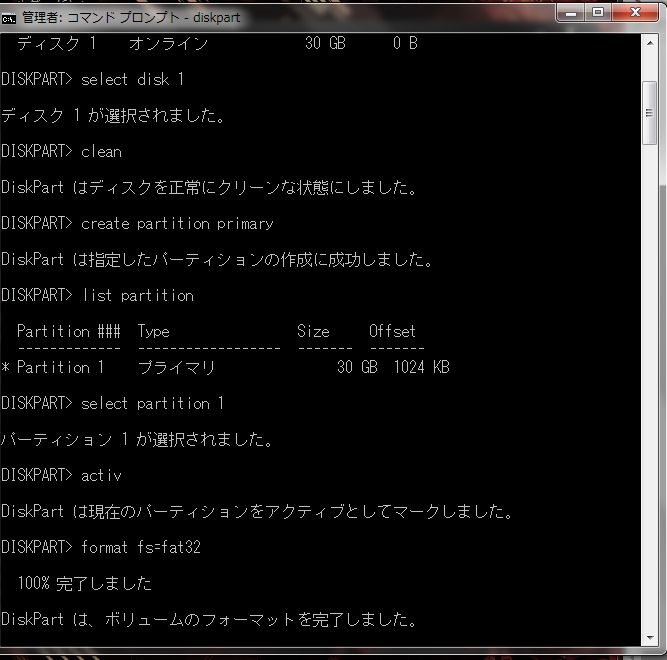 format fs=fat32 と、最後にこれでFat32形式でフォーマットをします。ここでは特に関係しないことなのでフォーマット形式についての説明は今回は省きます。