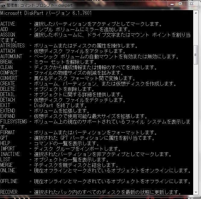 diskpart これはディスク(記憶領域を指定するための土台作りと考えてください)