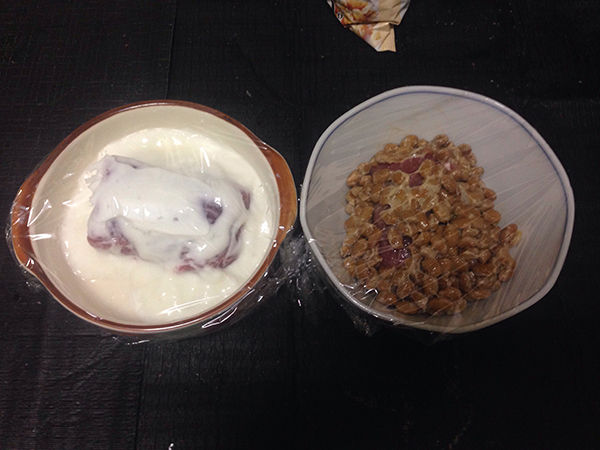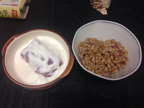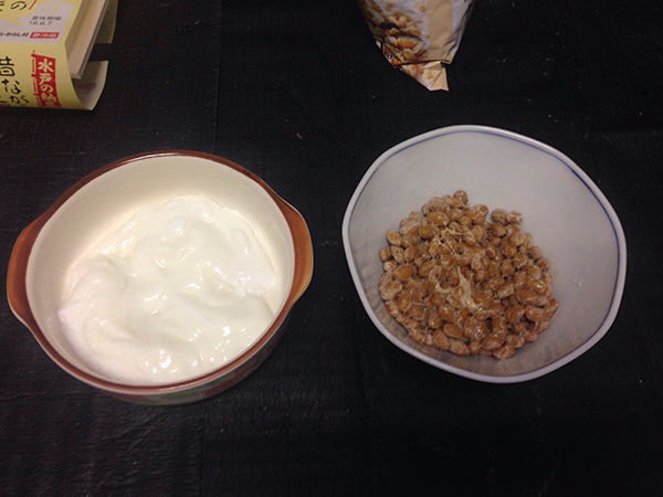 次に、それぞれの皿でもなんでもにヨーグルトと納豆を入れておきましょう。